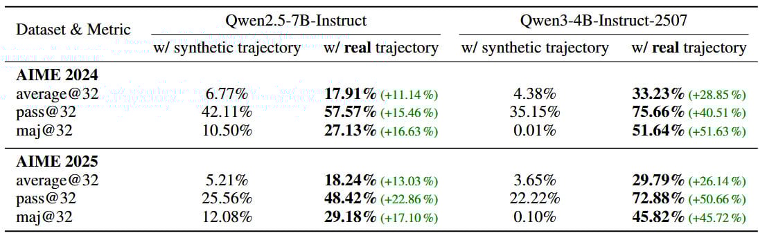 Data quality proved critical. Models trained on authentic, continuous learning trajectories captured full reasoning workflows, including planning, guided execution, error correction, and gear integration, while those trained on synthetic data underperformed by a large margin. Algorithm design also made a difference: token-level scoring combined with broader exploration and optimized rewards (GRPO-TCR) improved each stability and accuracy compared with conventional reinforcement learning approaches.