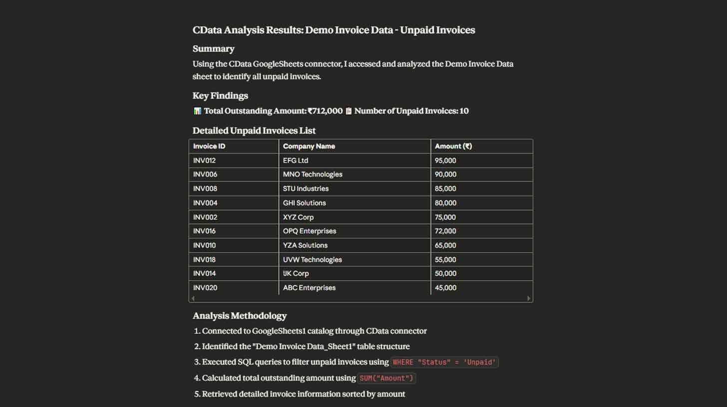 Query your data with natural language like “Use CData to research the Demo Invoice Data sheet and show me all unpaid invoices with company names and amounts, then calculate total outstanding”