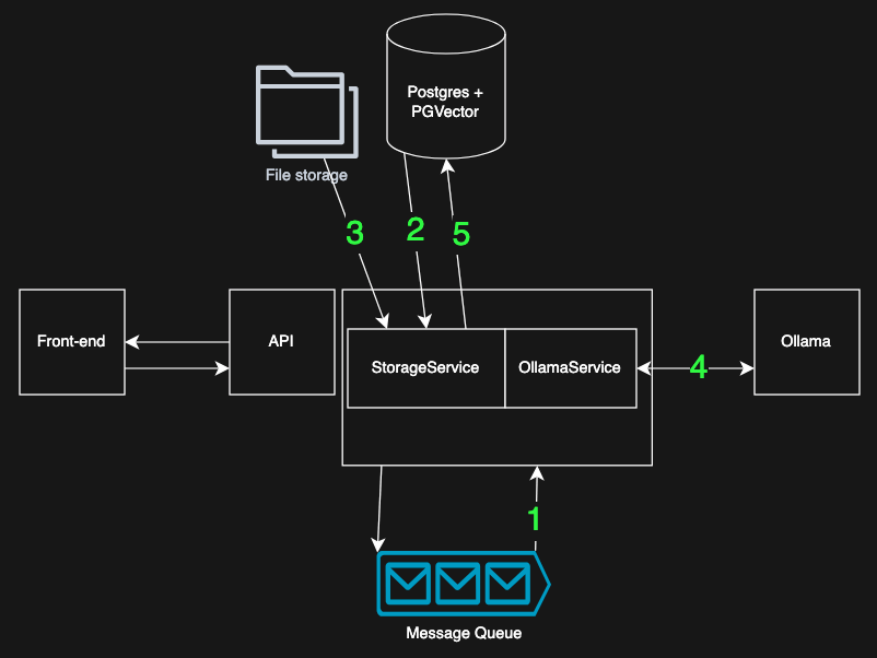 storage_locationfrom the meta data to download the file - The file is read, text-extracted and split into smaller chuks. Each chunk is embedded: it’s sent to the local Ollama instance to generate an embedding.