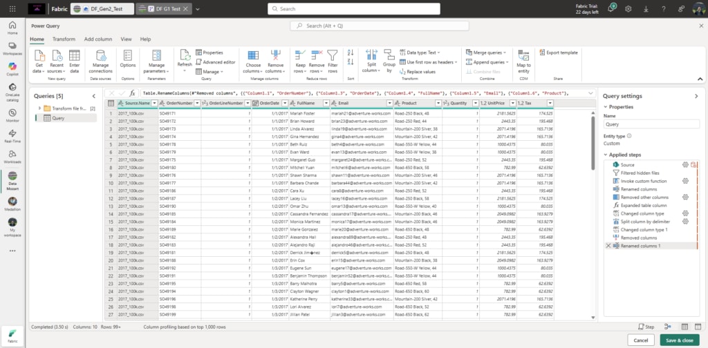 I plan to run two series of tests: first, include the Dataflow Gen1 within the comparison. On this scenario, I won’t be writing the info into OneLake using Dataflows Gen2 (yeah, I do know, it defeats the aim of the Dataflow Gen2), as I would like to match “apples to apples” and exclude the time needed for writing data into OneLake. I’ll test the next 4 scenarios, through which I perform some basic operations to mix and cargo the info, applying some basic transformations (renaming columns, etc.):