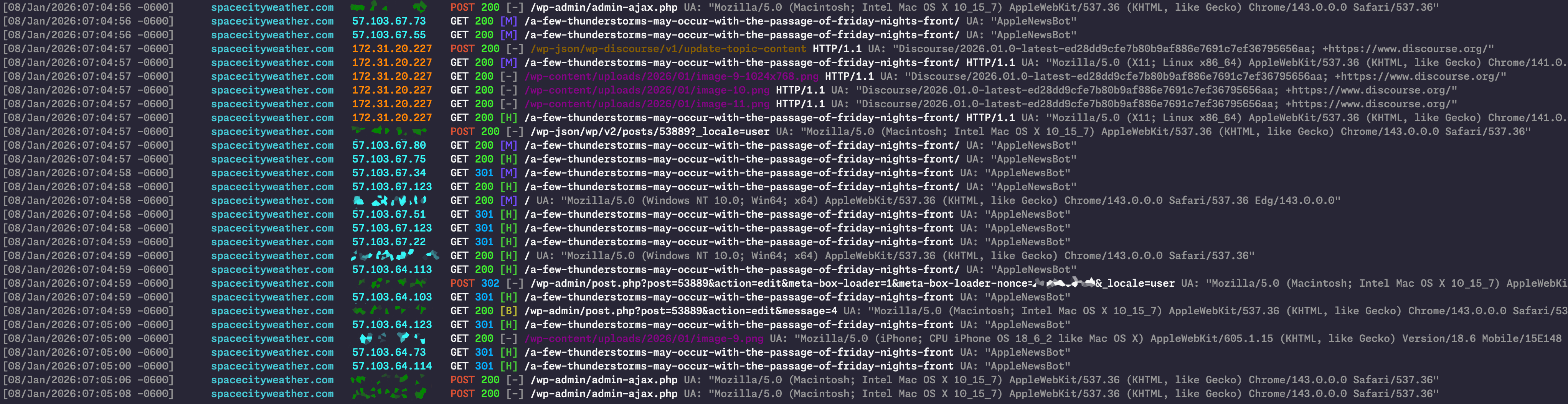 Less briefly: I’ve blurred out Eric’s IP address, however it’s dark green, so anyplace within the above image where you see a blurry, dark green smudge, that’s Eric. Within the roughly 12-ish seconds presented here, you’re seeing Eric press the “publish” button on his day by day forecast—that’s the “POST” event on the very top of the window. The following events from Eric’s IP address are his browser having the usual post-publication conversation with WordPress so it may possibly display the “post published successfully” notification after which redraw the WP block editor.